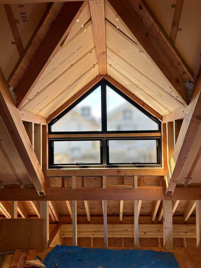 写真:建築家エモジンデザインスタジオ田中氏、山本氏が作成した外観CGパース。写真:棟上げ後の現場。急勾配の屋根とハト小屋窓。