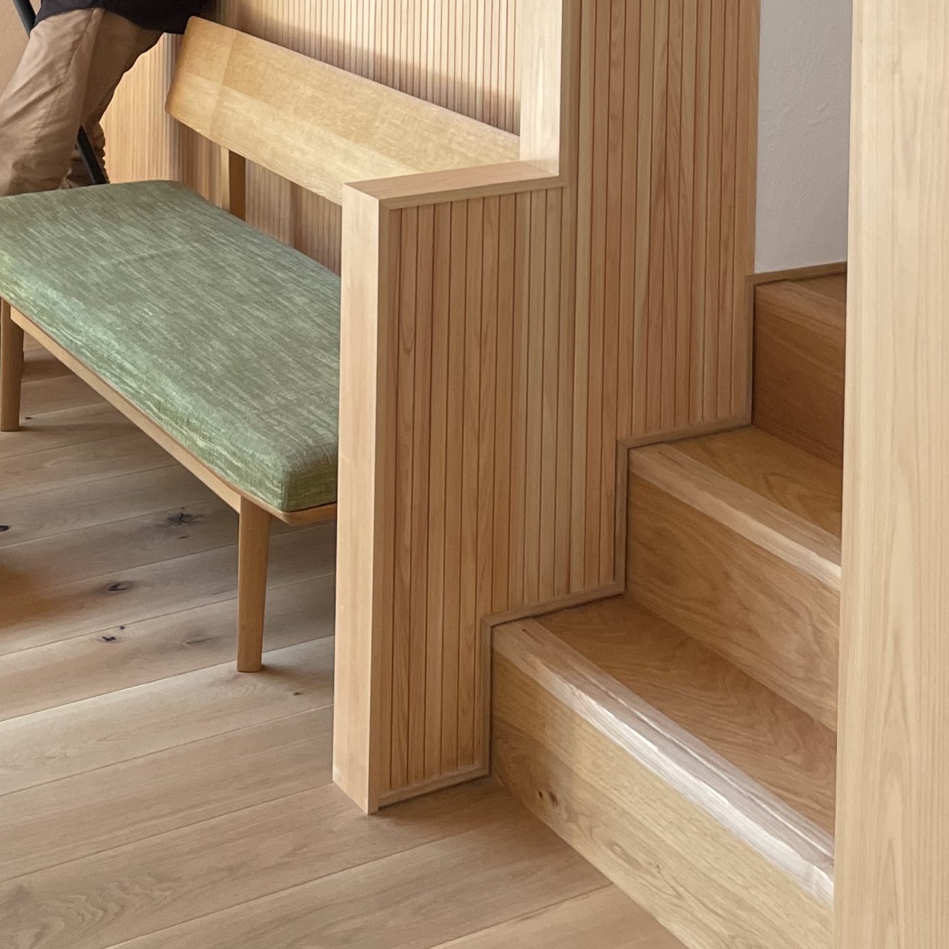 壁のリブと階段の角のラインを揃えた納まり。不要に思える細やかさの積み重ねが空間に深みと美しさを与えます。