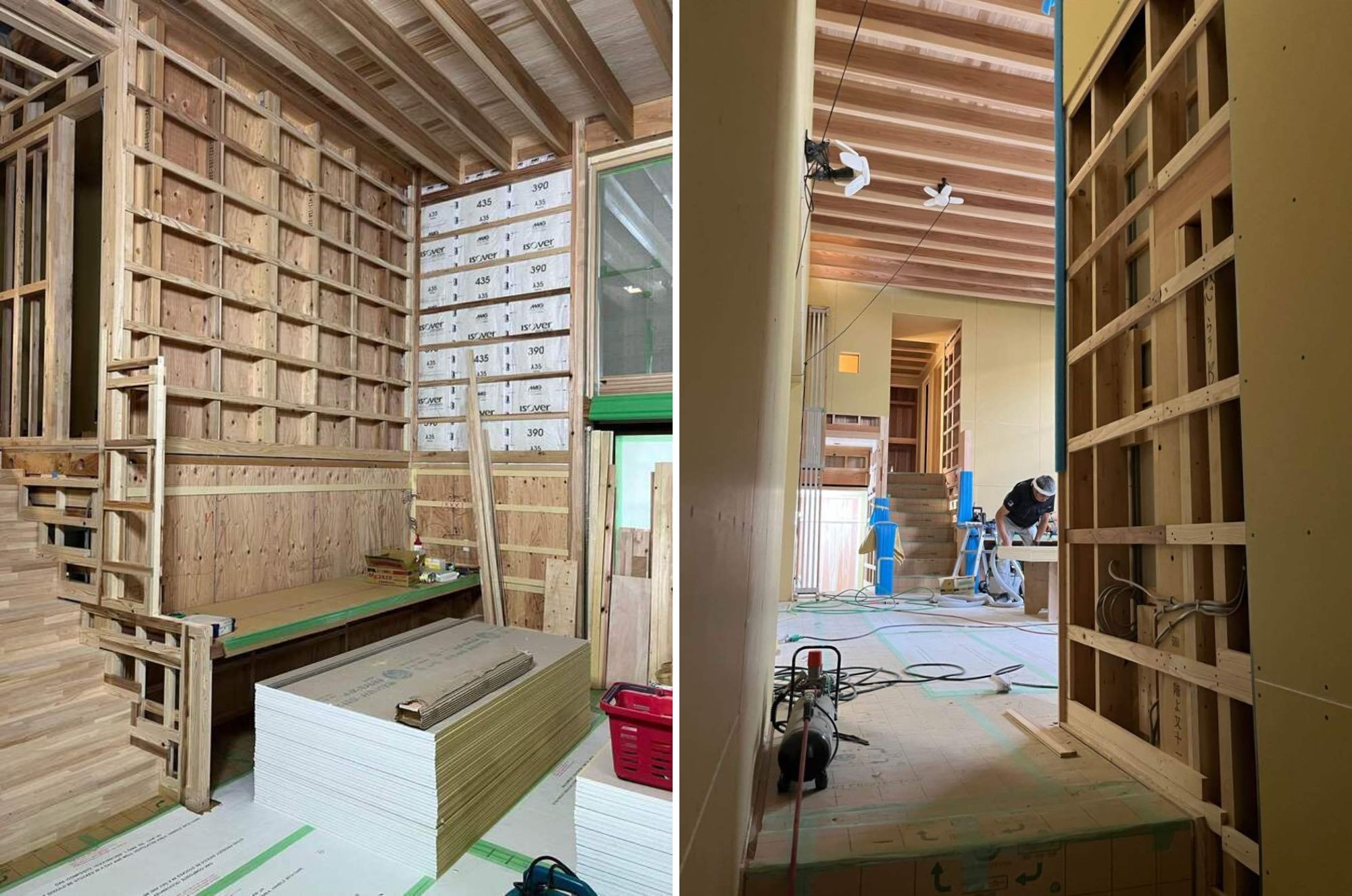 現場では岡本先生、有原監督と打ち合わせを重ね、岡本先生の考え込まれたデザインや細かい納まり、また無垢材を豊富に扱うため、適材適所、無垢材ならではの反りや癖を考えた納まりや仕口について、先輩大工さんや業者さんと休憩時間にも相談や打ち合わせを重ねました。お施主様や代表の谷口も現場に差し入れをしてくださり、現場に関わるたくさんの人に支えてもらいながら、常に本気で木工事を順調に進められました。感謝の気持ちでいっぱいです!