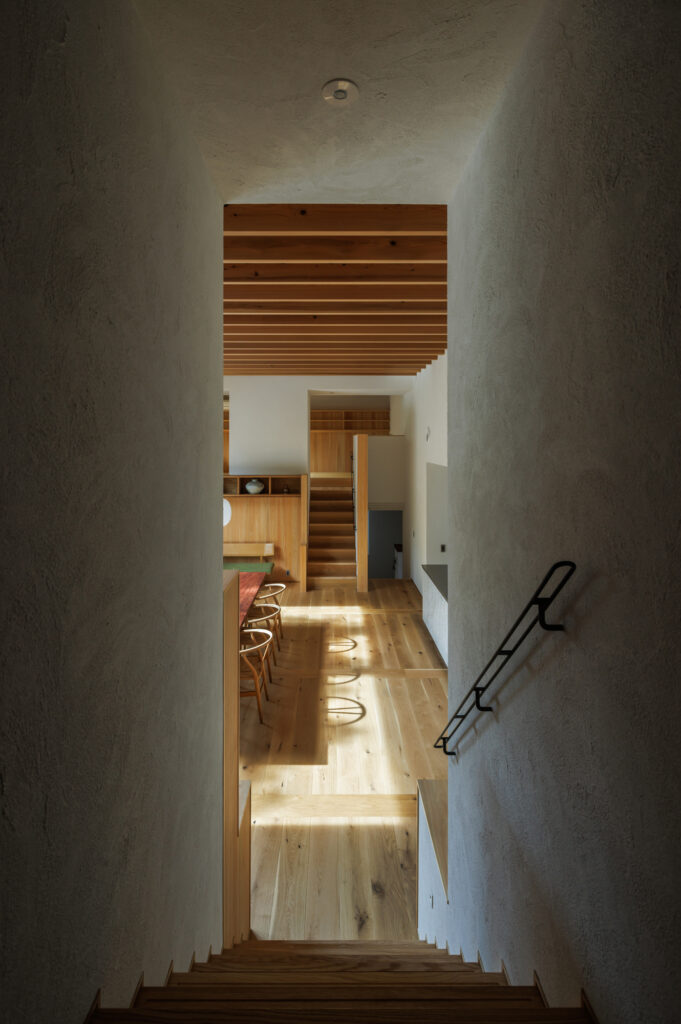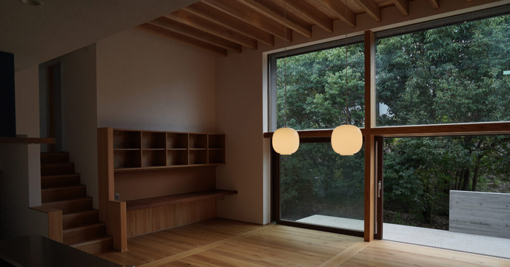 地下の剣道場の上に載る住居スペースはスキップフロアにし、元気なお子様たちが動き回れる活気あふれる空間にしました。リビングダイニングは大窓からの緑と光が降り注ぐゆったりとした空間としました。