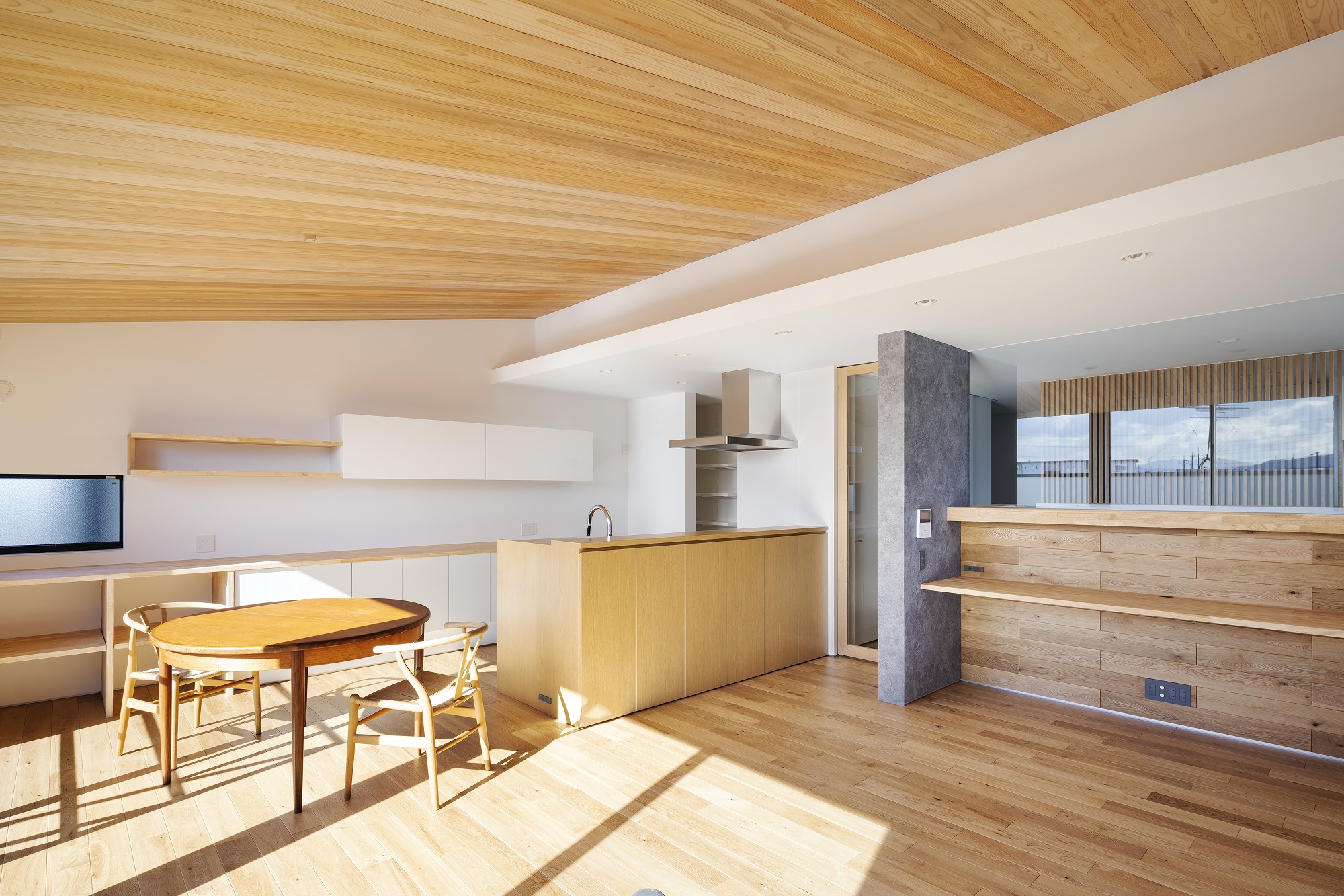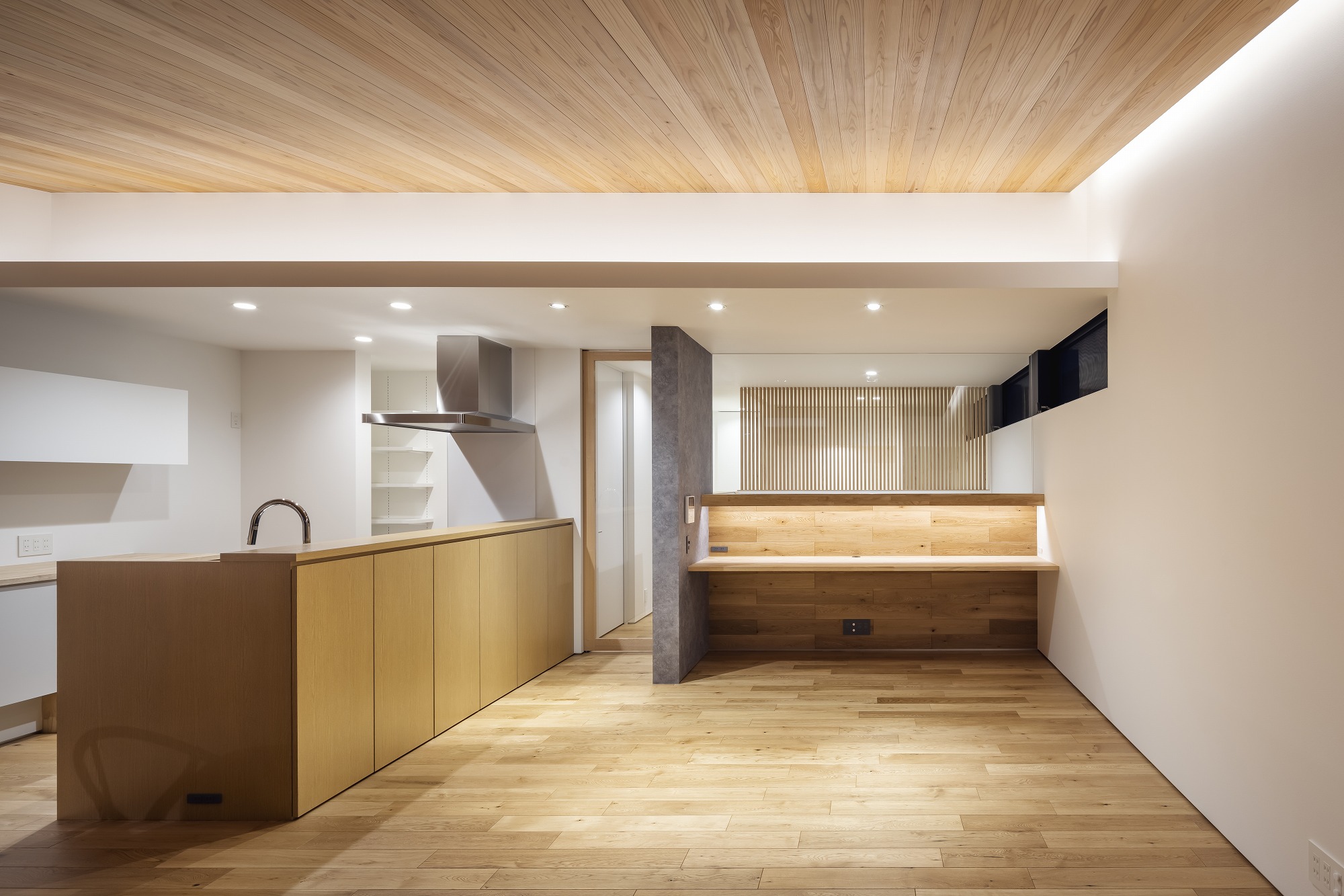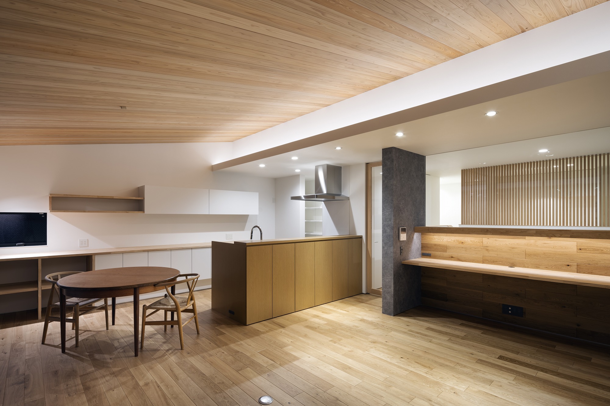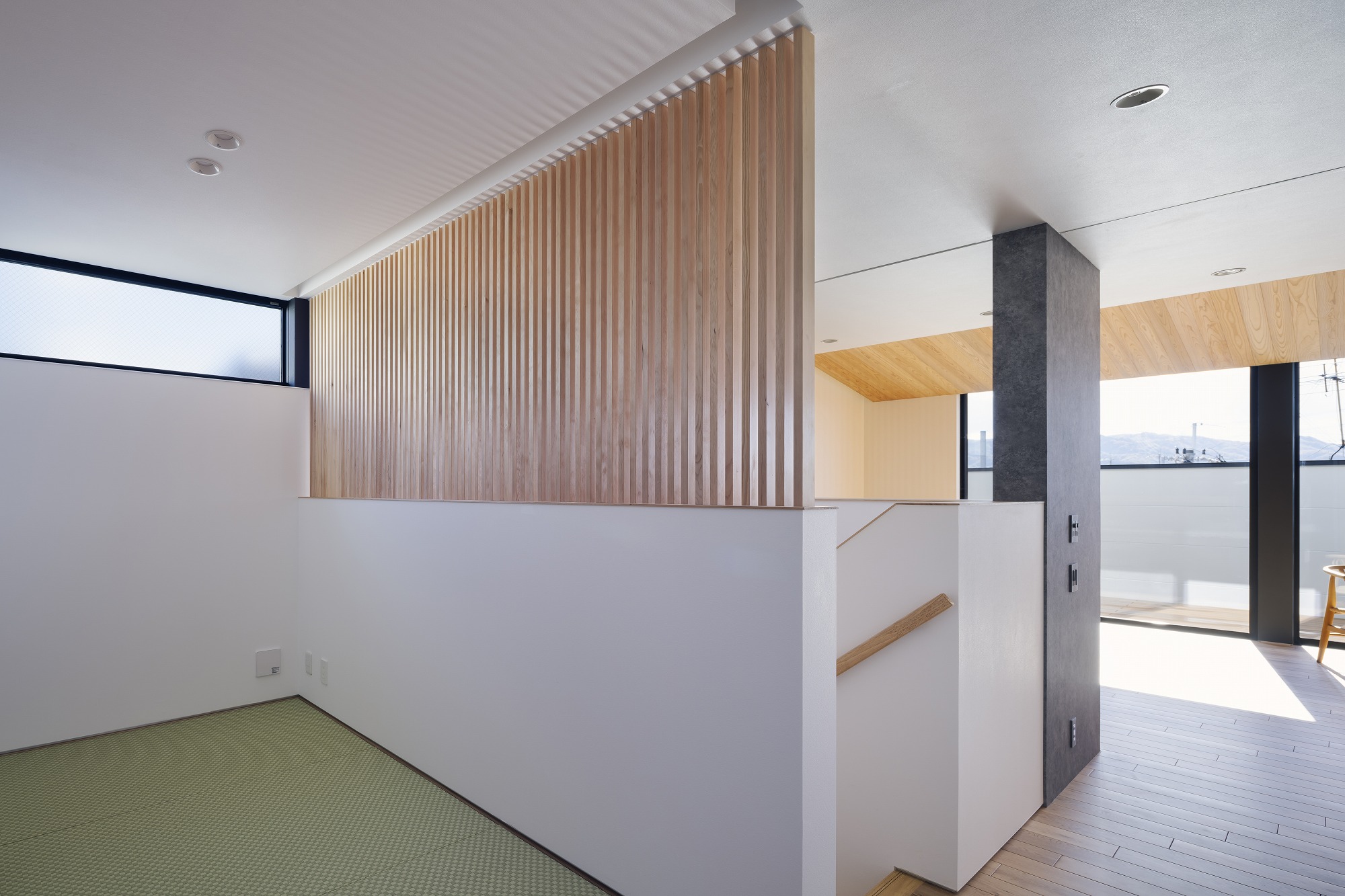 お施主様と様々な検討の結果、プライバシーを重視した開口部でありながら、明るさ、眺望も得たプランになりました。二階にはLDKの他、おこもり感のある和室も設け、リビングの木製ルーバーからもれる柔らかな光を楽しむことができます。一階には主に個室とお施主様念願のビルトインガレージを設けました。雨に濡れ濡れることなく車に乗降できる環境は羨ましいものです。