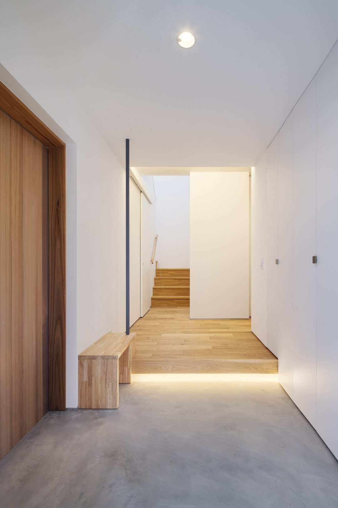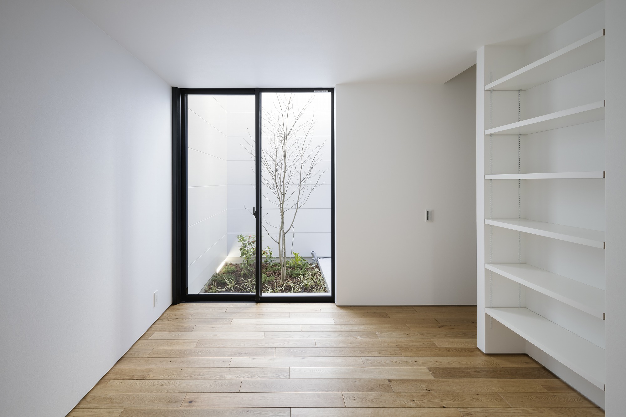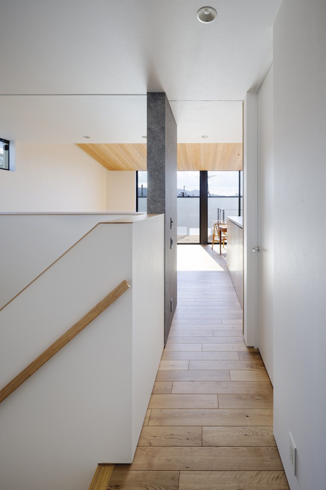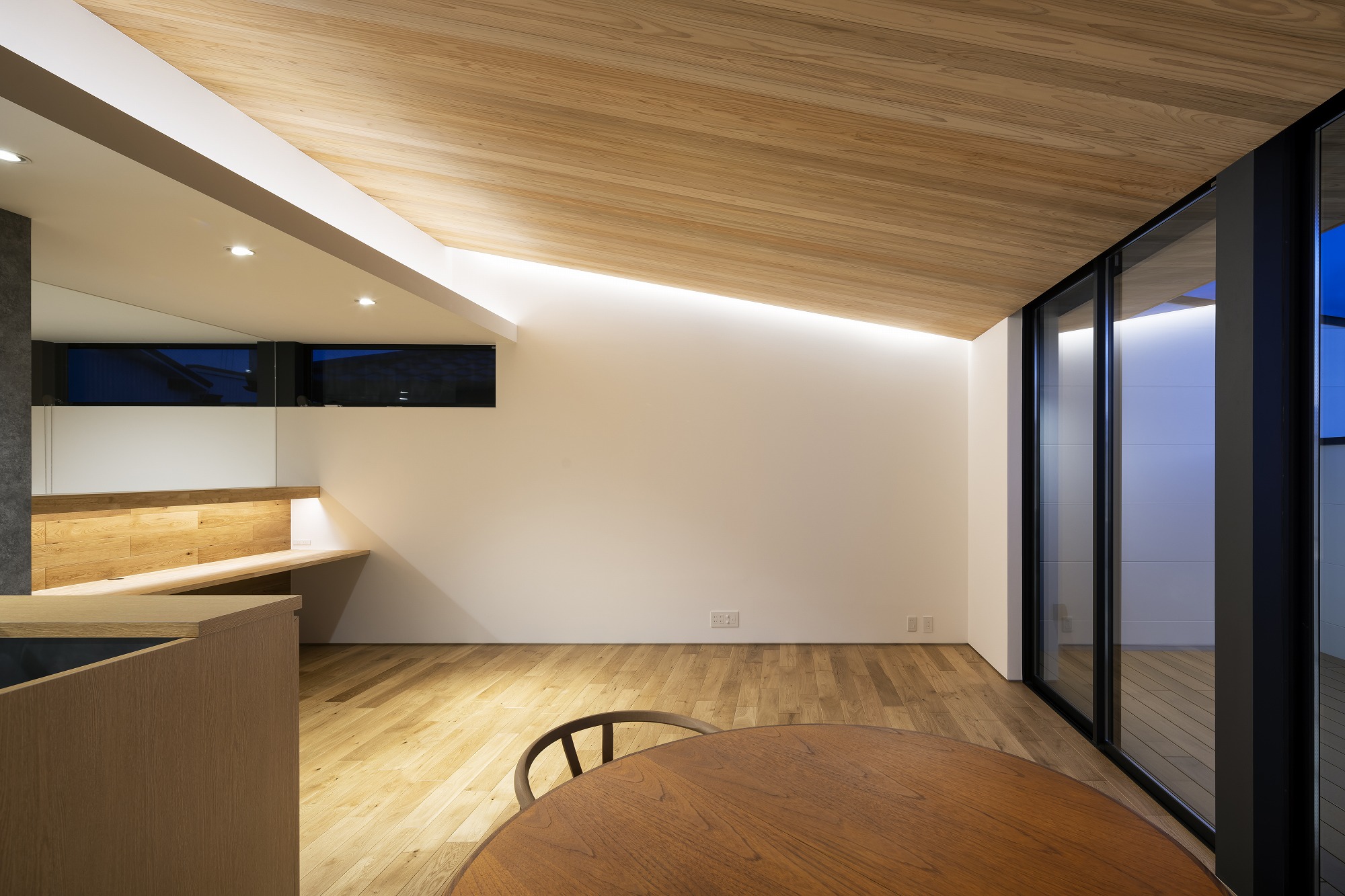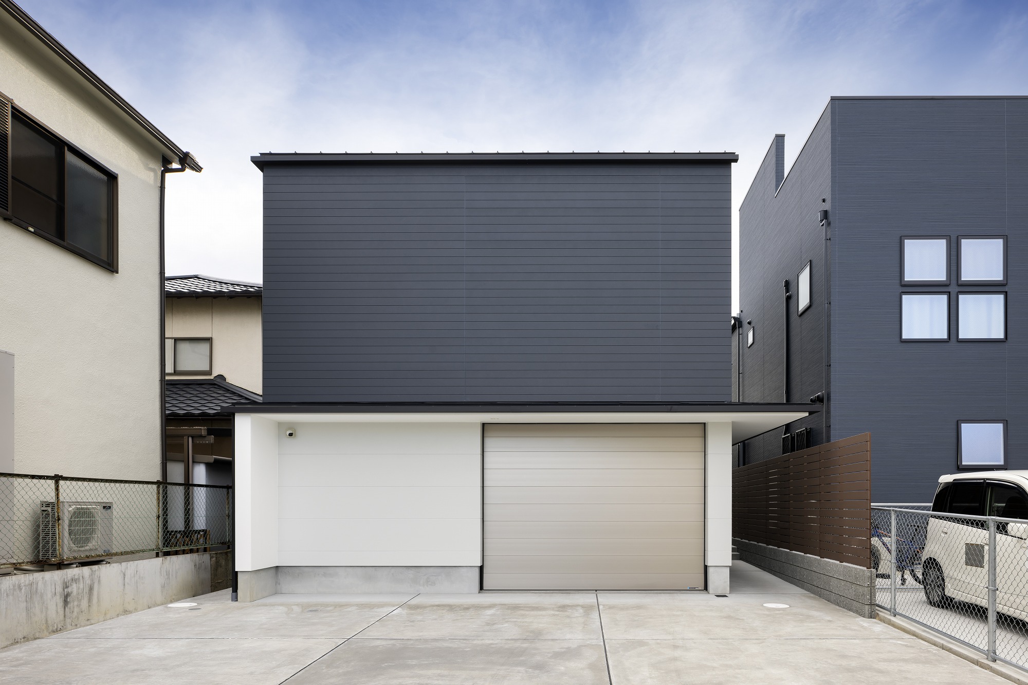 お施主様と様々な検討の結果、プライバシーを重視した開口部でありながら、明るさ、眺望も得たプランになりました。二階にはLDKの他、おこもり感のある和室も設け、リビングの木製ルーバーからもれる柔らかな光を楽しむことができます。一階には主に個室とお施主様念願のビルトインガレージを設けました。雨に濡れ濡れることなく車に乗降できる環境は羨ましいものです。
